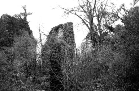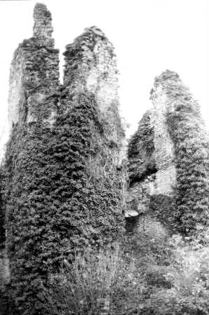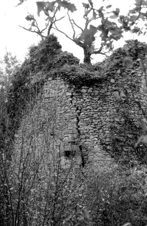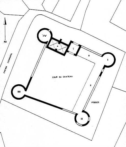Les murailles de la partie sud sont restées élevées, et on les voyait nettement, voici deux decennies, en marchant dans les fossés. L’intérieur du château se composait de deux vastes corps de bâtiments. Nous pouvons supposer que de nos jours, ces constructions se sont effondrées. La salle du rez-de-chaussée du donjon, où ouvre la porte d’entrée, possédait une voûte gothique à nervures prismatiques, et un beau pen- dantif central existait encore, bien qu’en mauvais état en 1880. Cette salle occupe toute la surface au sol du donjon, soit 6m50 de côté. Sur la gauche se trouvaient des salles d’habitation. Sur la droite, on pouvait admirer une chapelle, composée de deux travées qui mesuraient ensemble 12m60 de long sur 6m30 de large. Les voûtes possédaient des nervures rondes avec une baguette. Ce style de voûte permit de dater la chapelle soit de la fin du 14ème s. soit du début du 15ème s. C’était donc du gothique flamboyant. L’autre corps de bâtiment occupait tout le flanc est de l’enceinte. Déjà en mauvais état voici un siècle, il recouvrait de vastes caves dont l’accès était possible. On ne peut sans doute plus y accéder de nos jours, quand bien même on parviendrait à pénétrer dans la cour. Au midi et à l’ouest, les deux courtines qui portaient encore des galeries intérieures, reliaient une tour d’angle aux autres constructions. Bien entendu, tout le haut de ces courtines s’est effondré et dès le 19ème s. les créneaux des murailles avaient disparu. |