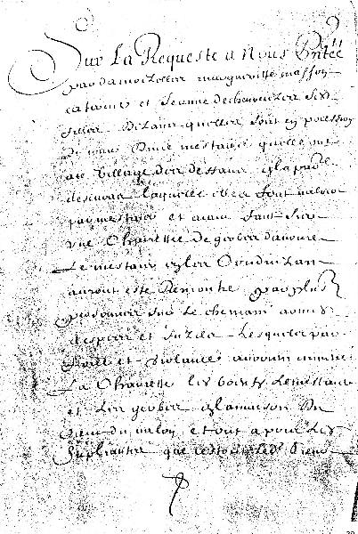 "Sur la requête à nous présentée par damoiselles Marguerite Masson, Catherine et Jeanne de Chevreuse ses filles, disant qu'elles sont en possession de jouir d'une métairie qu'elles ont au village des Deffaix en la paroisse d'Ecuras, laquelle elles font valoir par métayer et ayant fait sur une charrette de gerbes d'avoine, le métayer en la conduisant aurait été rencontré par plusieurs personnes sur le chemin avenant des Pies et sur cela, lesquelles par force et violence auraient emmené la charrette, les bœufs, le ... et les gerbes en la maison du sieur du Vallon; et ont appris les dites suppliantes que ce sont le dit sieur du Vallon et son fils qui auraient fait et fait faire le dit vol".