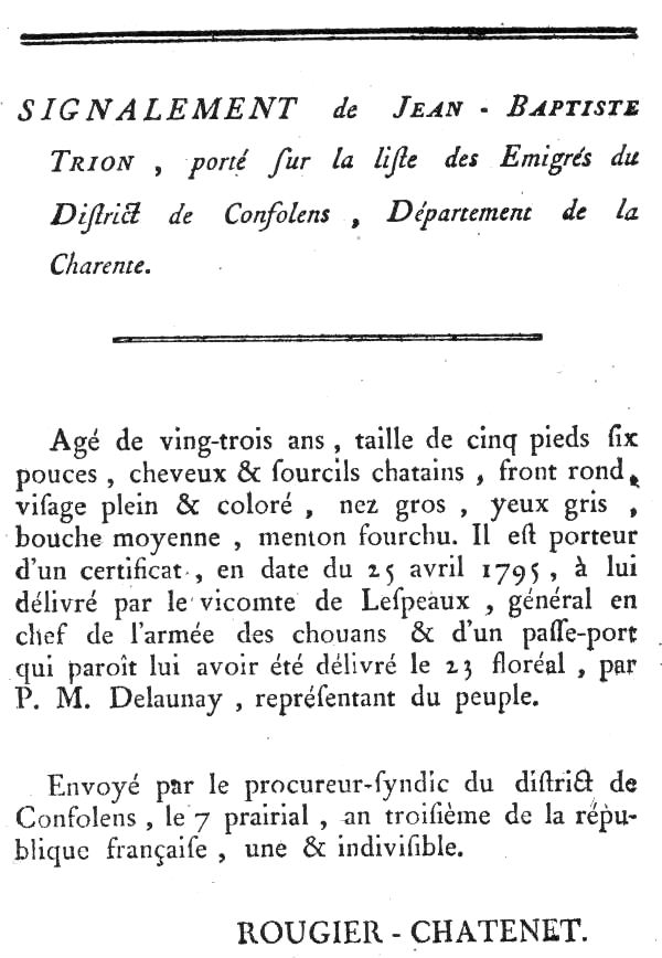Lorsque l'armée des Princes fut licenciée, dans le dénuement le plus total, Jean-Baptiste de Tryon ne passa pas dans l'armée de Condé, dont la lutte désespérée allait encore durer quelques années, mais il regagna clandestinement la France et rallia immédiatement l'armée royale vendéenne. Les guerres de Vendée étaient alors dans leur début (elles éclatèrent à la mi-mars 1793), et les Blancs triomphaient des Bleus d'une manière éclatante, périlleuse pour la République. Jean-Baptiste de Tryon combattit la République aussi longtemps qu'il le put sur la terre Vendéenne, mais, de nouveau, il abandonna cette lutte quand il la comprit perdue. L'avis de recherche en date du 7 prairial an trois que nous présentons le dit "porteur d'un certificat en date du 25 avril 1795, à lui délivré par le vicomte de Lespeaux (?) général en chef de l'armée des chouans, et d'un passeport qui parait lui avoir été délivré le 23 floréal par P. M. Delaunay, représentant du peuple". Par vicomte de Lespaux, il faut certainement entendre comte de Scépeaux. Jean-Baptiste de Tryon était alors âgé de vingt-trois ans. |