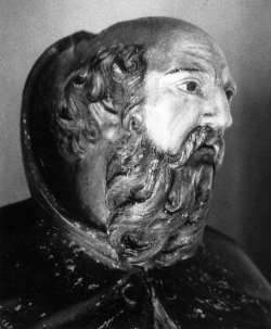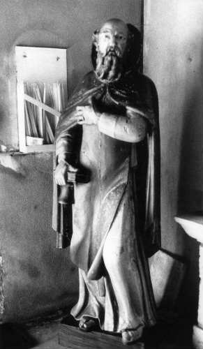La statue hiératique de notre Saint Antoine, debout dans le coin gauche de l'entrée de la nef représente un homme mûr, grandeur nature, au noble visage grave, tourmenté. Sa polychromie d'origine, intacte, est d'une bonne facture. Nous noterons une habile restauration du pied gauche manquant. Il porte le costume des Carmes : longue robe blanche à amples manches sur laquelle est passée l'étroite chasuble brune, assortie à la chappe dont la capuche est rabattue derrière la tête. Il est nu-pieds et en sandales. Bien qu'obéissant aux règles très conventionnelles de la statuaire religieuse baroque du 17ème s. l'expression du visage du saint est frappante. Ce beau visage austère ne vit que par le regard insistant, anxieux des yeux sombres fixés sur nous. Aucune chaleur dans un tel regard, mais bien plutôt quelque chose d'halluciné, de contraignant, d'angoissant. Ce regard est d'autant plus surprenant que nous retombons dans le conventionnel le plus banal dans tout le traitement de la tête et du visage : la classique calvitie, la couronne de cheveux frisés, la longue barbe bouclée, et le modelé de la bouche entre-ouverte. Le saint replie son bras gauche sur sa poitrine, geste de dévotion propre à toutes les religions judéo-chrétiennes, tandis que de sa main droite, il tient une clochette et un livre de prières. Voici le geste qui le caractérise et qui lui donne, outre son regard, sa force d'existence personnelle. Tout est très figé dans cette statue, que seule la vie du regard allume, et dont le sang qui gonfle les veines des mains, belles et puissantes, semble alimenter la force immobile. |