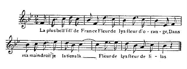 | La plus belle fille de France, Fleur de lis, fleur d'orange, Dans ma main droite je la tiens là, Fleur de lis, fleur de lilas. |