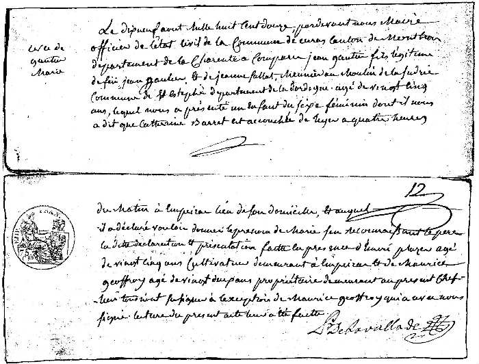 Dans la marge : naissance de GAUTIER MARIE. "Le dix neuf août mille huit cent douze par-devant nous Maire officier de l'état Civil de la commune d'Ecuras canton de Montbron département de la Charente a comparu JEAN GAUTIER fils légitime de feu Jean Gautier et de Jeanne Salât, meunier au moulin de la Surie commune de Saint-Estèphe département de la Dordogne, âgé de vingt cinq ans, lequel nous a présenté un enfant du sexe féminin dont il nous a dit que CATHERINE BARRET est accouchée de hyer a quatre heures du matin à Empeira lieu de son domicile, et auquel il a déclaré vouloir donner le prénom de MARIE s'en reconnaissant le père la dite déclaration et présentation faite en présence d'(illisible) Plazer, âgé de vingt cinq ans cultivateur demeurant à Empeira et de Maurice Geoffroy âgé de vingt deux ans propriétaire demeurant au présent chef-lieu tous n'ont su signer à l'exception de Maurice Geoffroy qui a avec nous signé. Lecture du présent acte leur a été faite". Signé : P. Delavallade. |